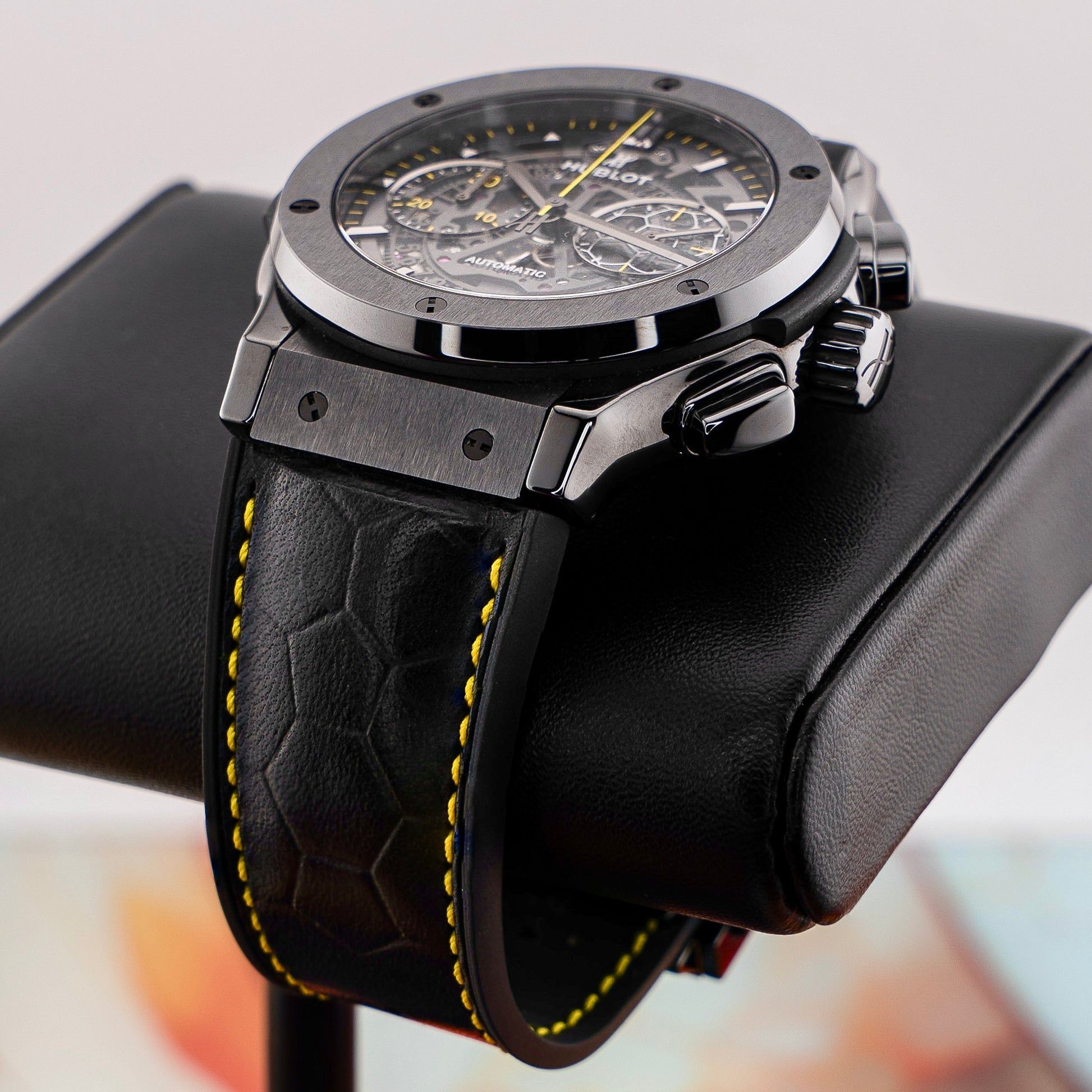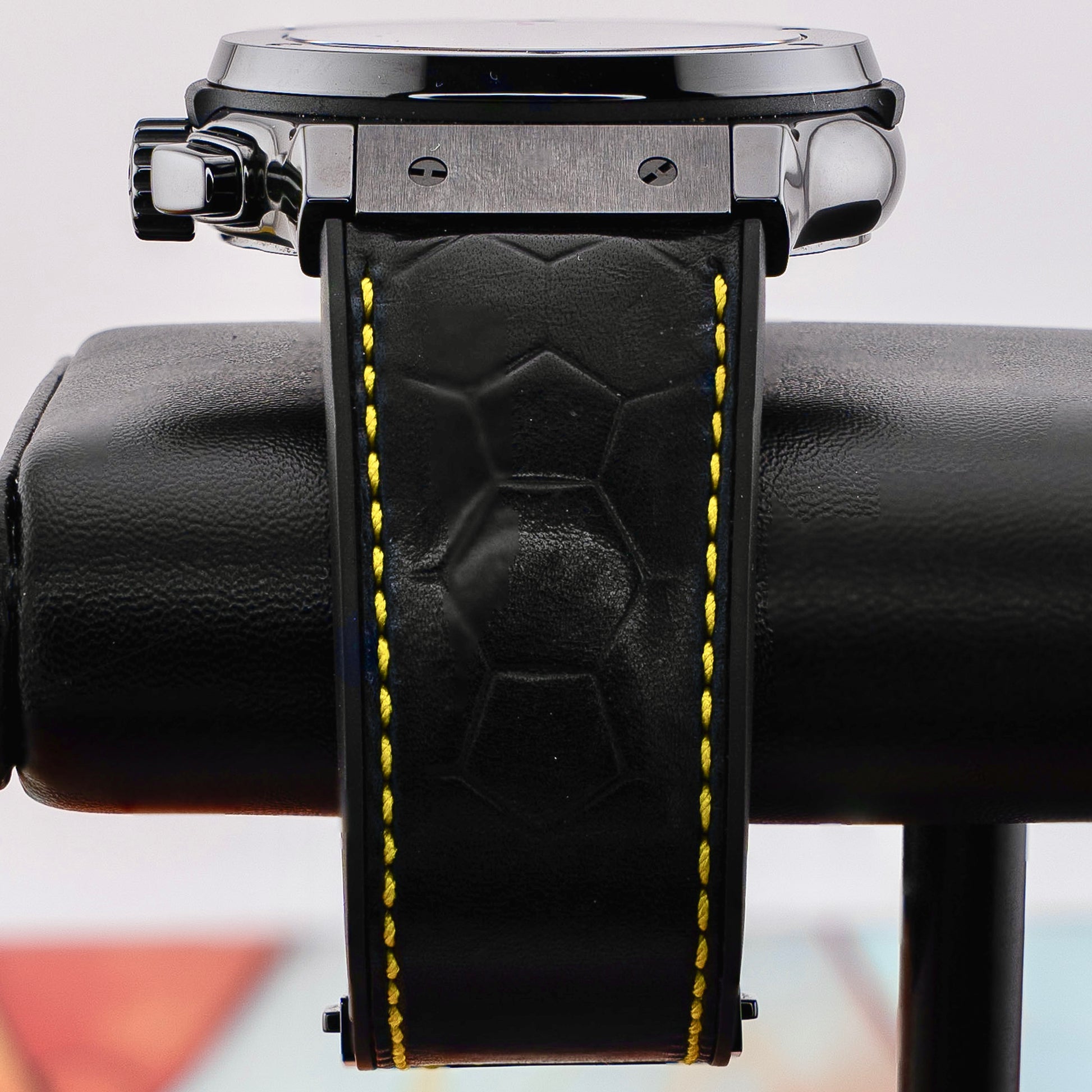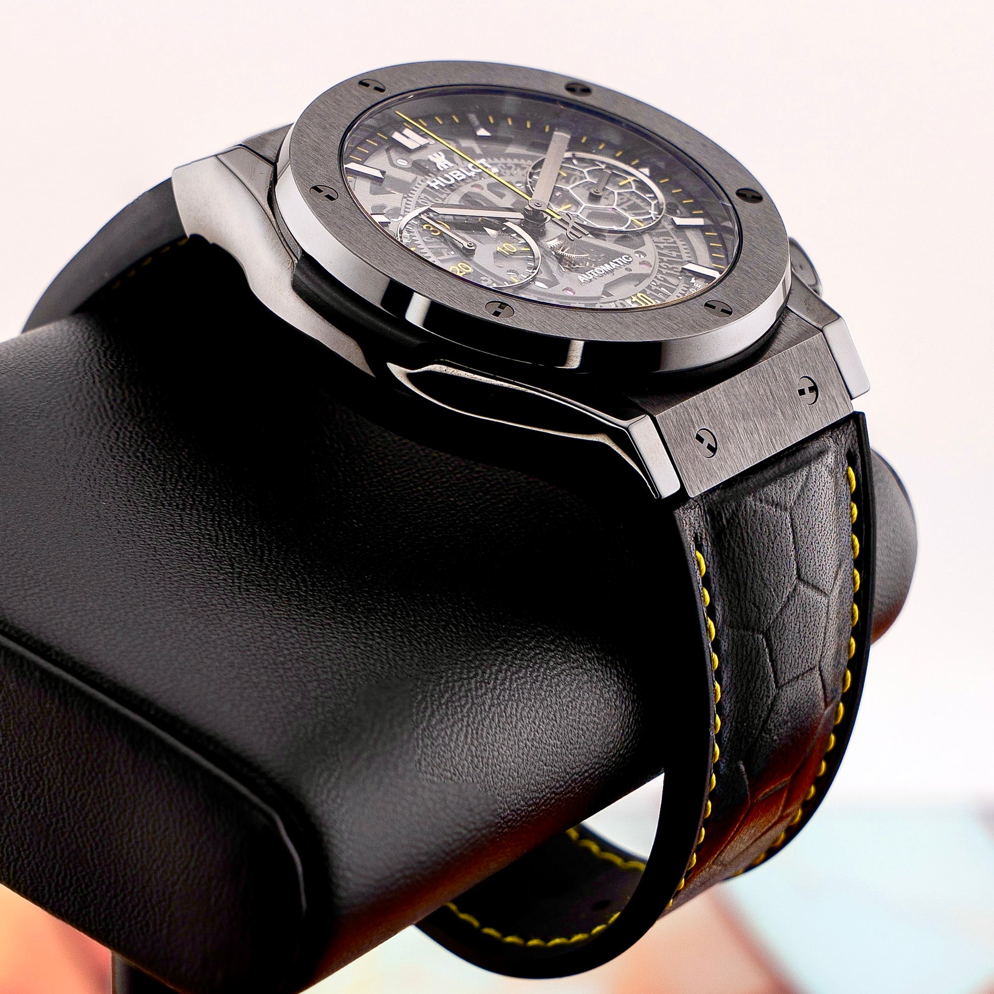 This Hublot Classic Fusion Aerofusion in the right 45mm size for Hublots, skeleton dial, ceramic dial, ceramic bezel, ceramic casing (with two different types of finishes: brushed and glossy), yellow chrono hand, yellow accents in the dial and subdial, yellow “10” date to commemorate Pele’s jersey number, yellow stitched strap, soccer ball pattern on the subdial and on the strap, and Pele’s signature and kick on the open backing.
